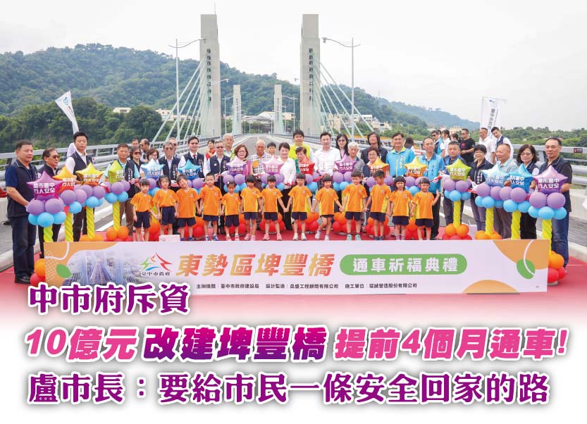 台中市東勢區重要交通建設──埤豐橋改建工程提前4個月完工並正式通車!埤豐橋是東勢山城第一座跨越大甲溪的重要橋梁,使用已逾40年,連結台中東勢、豐原、石岡、新社及苗栗卓蘭,是當地重要聯絡道路。由於921大地震造成橋梁受損,加上大甲溪河道不斷下切影響穩定性,市府斥資10億元推動改建,打造全新「雙塔斜張橋」,盧秀燕市長於9月1日親自主持通車祈福典禮,見證山城交通建設提前達標的重要里程碑。