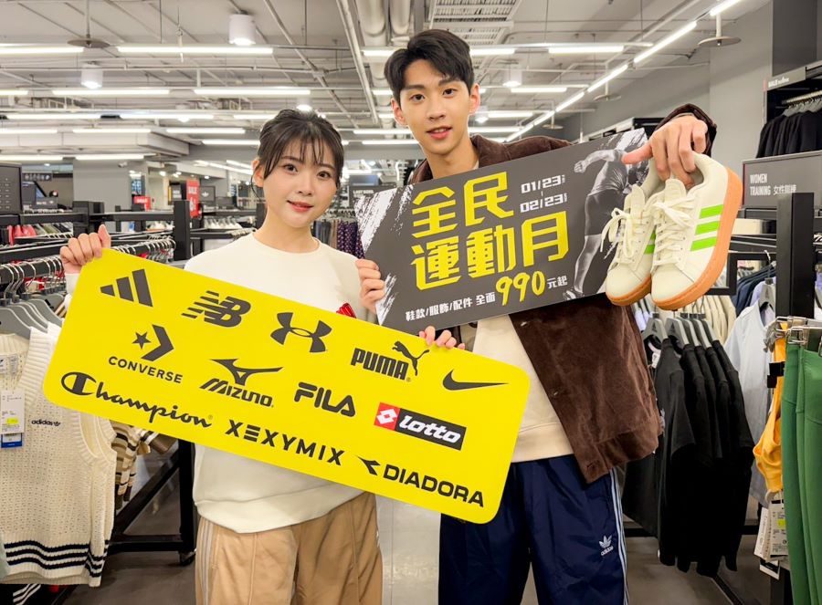 農曆新年將近,不少民眾開始為過年出遊、運動計畫與新年目標添購裝備,台中日曜天地OUTLET從1月23日至2月23日推出「全民運動月」,集結 ADIDAS、NIKE、New Balance、FILA、PUMA、Under Armour、CONVERSE、MIZUNO等近20大運動品牌,涵蓋鞋款、服飾、包款與配件,精選鞋款990元起,另有多樣千元有找的限量商品。
