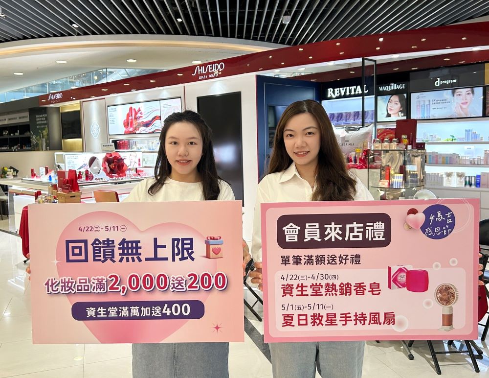 本次檔期主打「零售與美妝」雙重回饋,化妝品滿2,000元送200元累贈無上限,首五日更祭出甜蜜好禮,單筆滿5,000元即可兌換法芙妮150元點心券,讓購物時光更添份療癒。針對品牌鐵粉,資生堂獨家推出滿13,000元加送400元,整體回饋率最高達13.5%。全館品牌同步享有滿3,000元送300元累贈無上限;針對2F、3F精選服飾與鞋包配件,特別加碼「美力升級」優惠,累計滿8,000元加贈300元,讓消費者從穿搭到保養一次到位。
