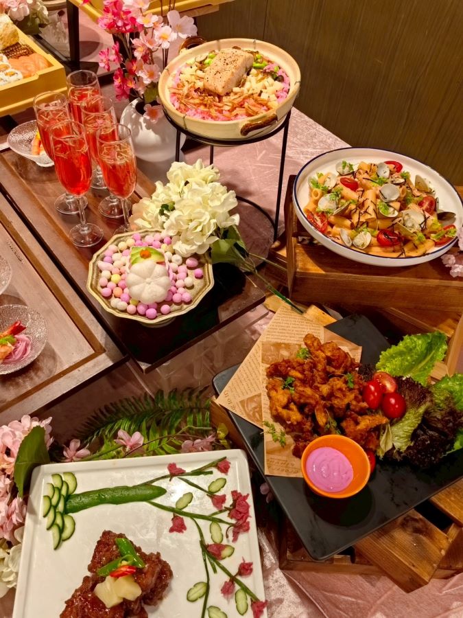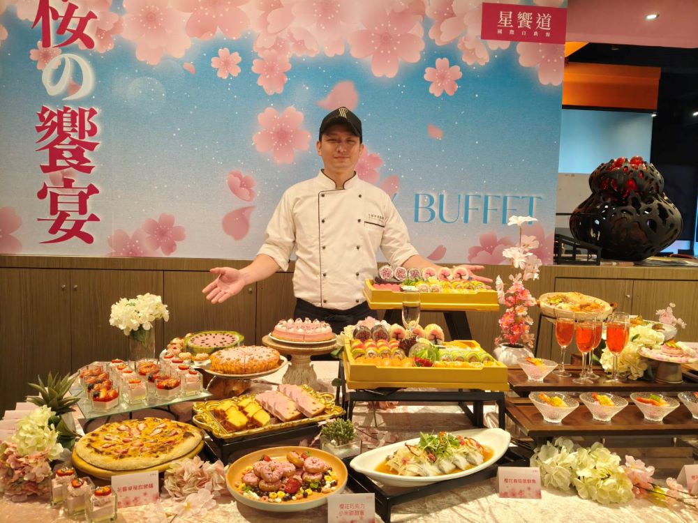 星饗道國際自助餐以「桜の饗宴:粉色食驗室」為主題,運用日本鹽漬櫻花入菜,從前菜到熱食皆洋溢春日氣息。包含櫻花最中餅、櫻花壽司、櫻花冷細麵與櫻花洛神篿菜醋等多道春季限定料理;熱食則推出櫻花鮭魚炊飯與櫻花春筍蒸鮮魚,層層堆疊春日風味。活動即日起至5月31日止,三月平日午、晚餐推出「穿粉色4人同行1人免費」限定優惠,邀請消費者與好友共享粉嫩食光。
